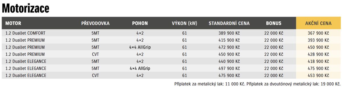 Kompaktní Swift přijíždí zlevněný o 22 000 Kč ve všech variantách, startuje od 367 900 Kč v předokolce a od 450 900 Kč ve čtyřkolce. Pohonným ústrojím je mild-hybridní tříválec 1,2 litru o nevysokém výkonu 81,5 koně a točivém momentu 108 Nm, který přenáší buď pětirychlostní manuál, nebo variátor CVT.