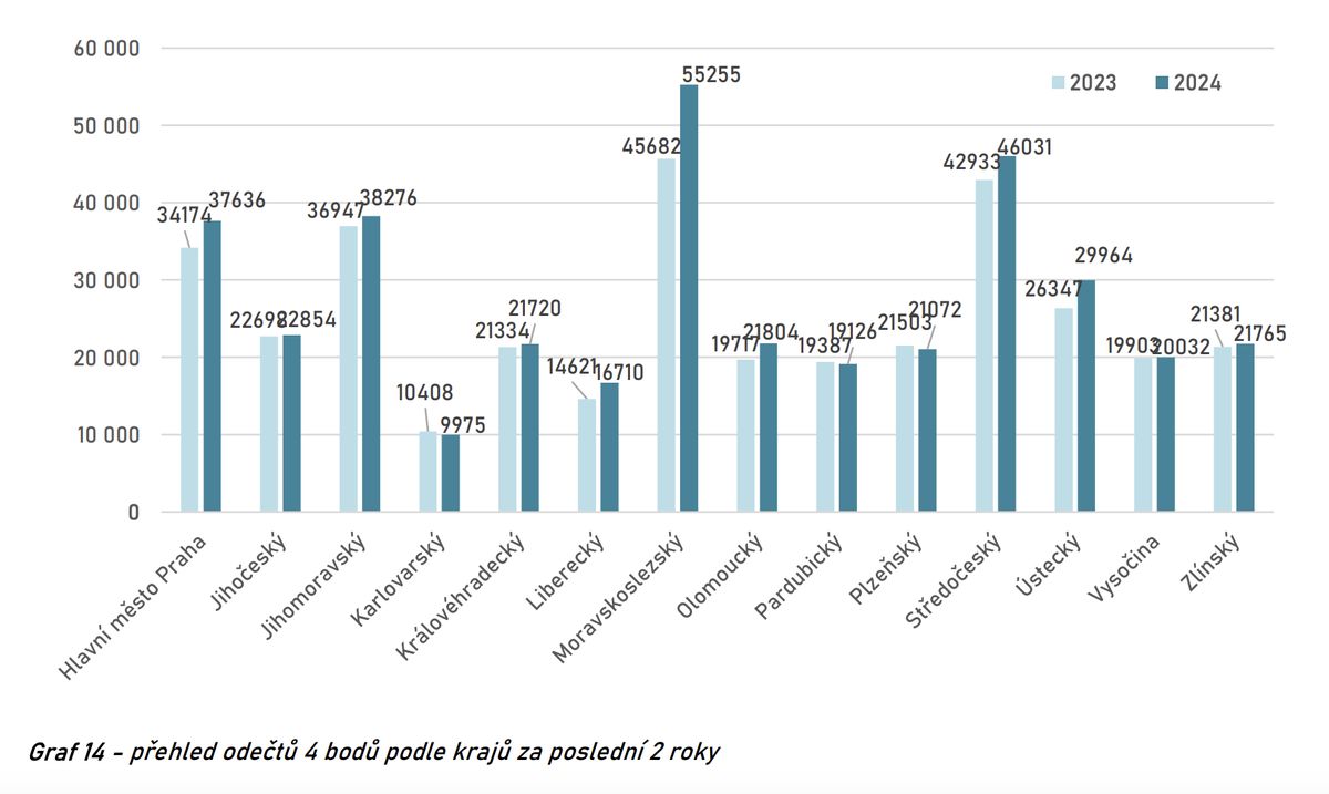 - Počet bodovaných řidičů ve srovnání s rokem 2023 celkově klesl ve všech krajích až na Plzeňský.