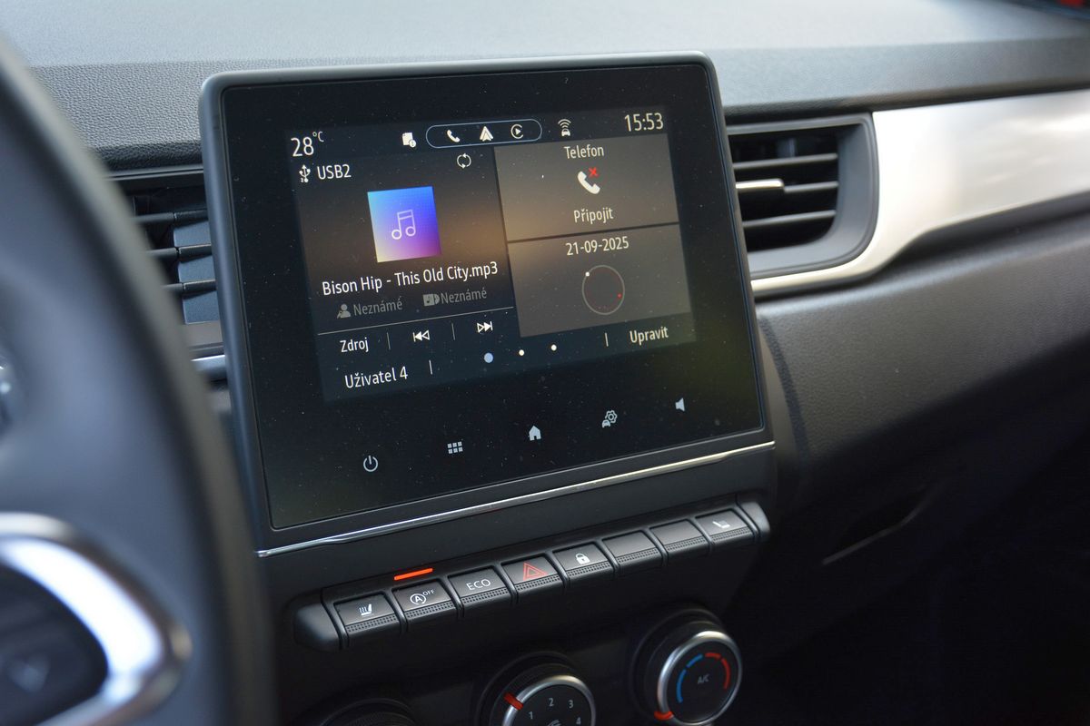 Captur se sice snaží řidiče „buzerovat“ co nejméně a tato verze tu má vlastně jen stop/start. Asistent jízdy v pruzích se zdál celou dobu vypnutý, případně aspoň vůbec nic nedělal. Jen odpoledne při jízdě proti slunci v lese s těmi ostrými stíny plašil systém upozornění před kolizí a vysílal do auta několikrát falešné poplachy. Asi bych se také obešel bez protivné „uvítací“ melodie po nastoupení do auta (nikde jsem nenašel, jak se to vypíná) a určitě by neškodilo zrychlit palubní infotainment.