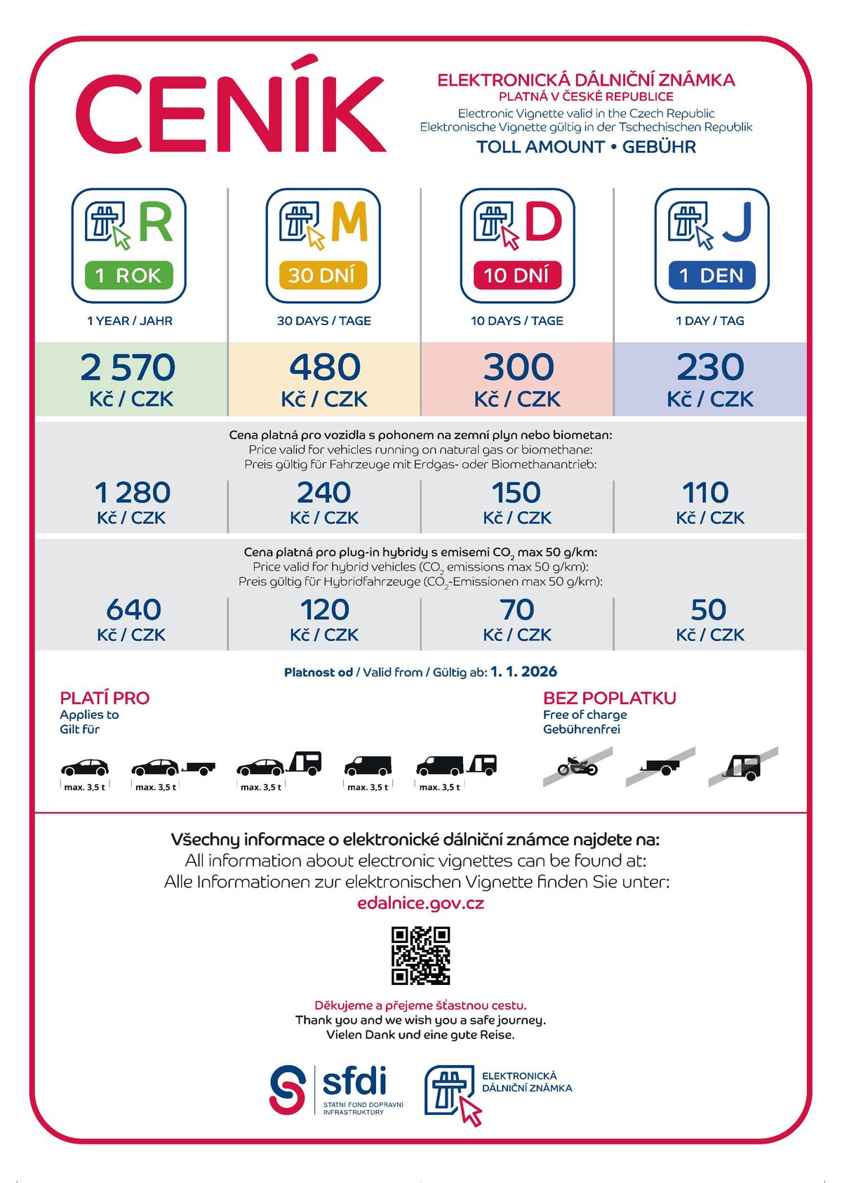 Ministerstvo dopravy dnes oficiálně potvrdilo, že cena dálničních známek v Česku pro rok 2026 vzroste, byť nikterak dramaticky. Jednodenní známka přijde na 230 Kč (+20 Kč), desetidenní nově stojí 300 Kč (+10 Kč), za třicetidenní dáte 480 Kč (+20 Kč), celoroční podražila o 130 korun na 2 570 Kč.