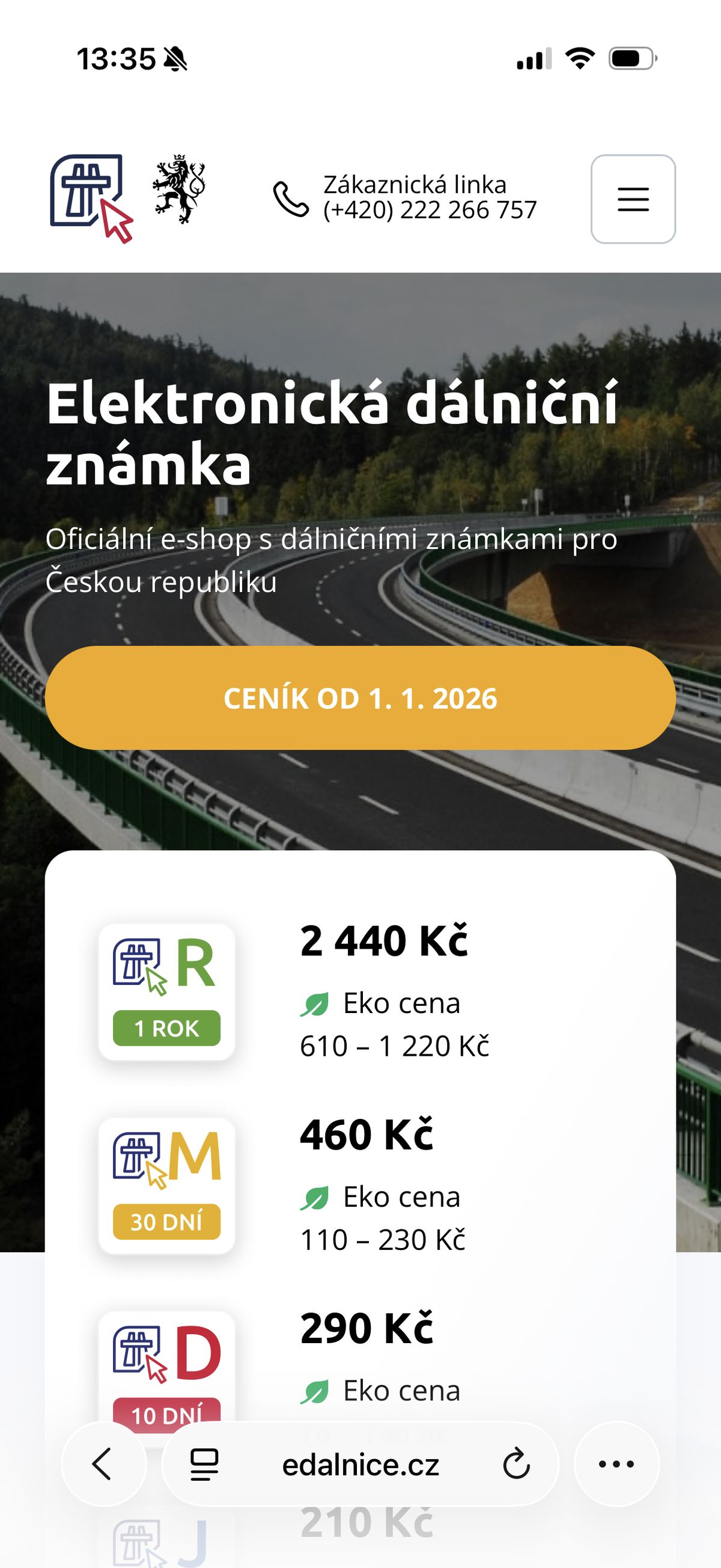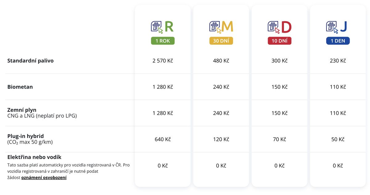Oficiální ceník dálničních známek pro rok 2026 včetně zvýhodněných alternativních paliv.