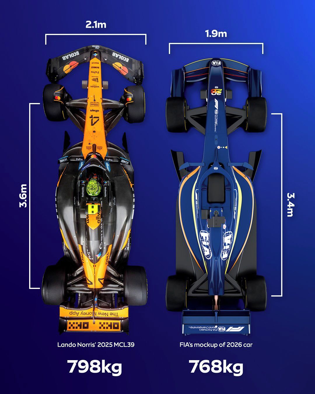 Vizuální velikostní srovnání monopostů minulé a současné generace.
