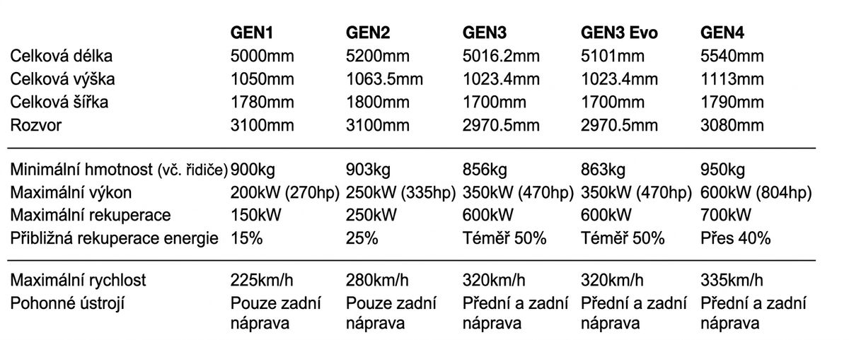 Tyhle 5,54 metru dlouhé stále čtyřkolky o minimální hmotnosti 950 kg mají baterku s využitelnou kapacitou 51,25 kWh, ovšem taky brutální rekuperaci výkonem 700 kW (350 kW každý motor), proto si přes 40 % energie potřebné pro závodění narekuperují.