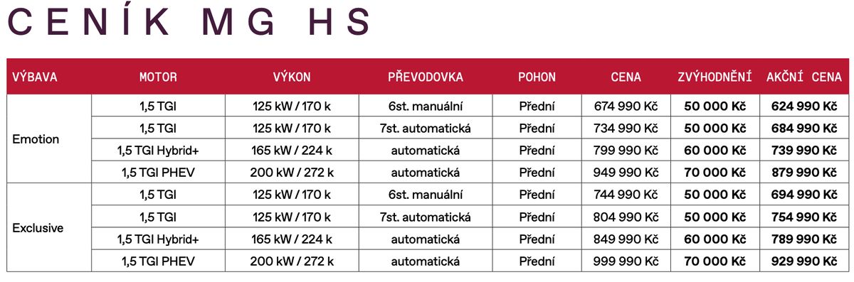 Nyní si české zastoupení MG Motor připravilo akci, kde cenu základního provedení sráží na hodně zajímavou úroveň. Za 624 990 Kč totiž prodává model HS se čtyřválcem 1,5 litru o 170 koních spojeným s šestirychlostní manuální převodovkou, která posílá točivý moment 275 Nm na přední kola. Akční ceny se zvýhodněním až 70 tisíc korun se však vztahují i na ostatní pohonné jednotky.