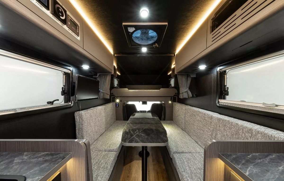 Do obytného prostoru se chodí zadními dveřmi po elektricky výklopných schůdcích, uvnitř na vás dýchne útulná atmosféra hotelového pokoje. Své místo tady má jídelní kout se dvěma pohovkami přeměnitelnými na spaní, nad kabinou je druhé dvojlůžko.