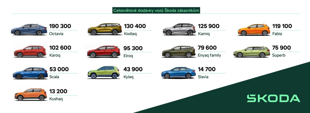 Nejprodávanějšími modely byly Octavia (190 300 vozů), Kodiaq (130 400 vozů), Kamiq (125 900 vozů), Fabia (119 100 vozů). Dodávky elektrifikovaných vozů se loni víc než zdvojnásobily, celkem šlo o 218 700 elektrifikovaných vozů, meziročně o 117,5 procenta více.