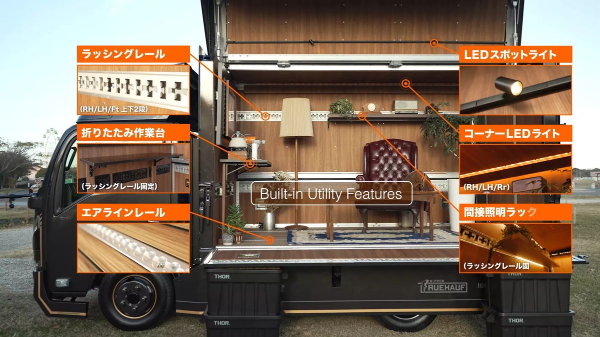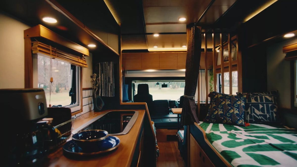 Zadní část tak nabídne ochranný rám, střešní nosič, přídavné osvětlení, uvnitř najdeme malý byt se spoustou dřeva, jídelní kout rozložitelný na postel, sezení, kuchyň nebo ložnici s projektorem určeným k promítání filmů.