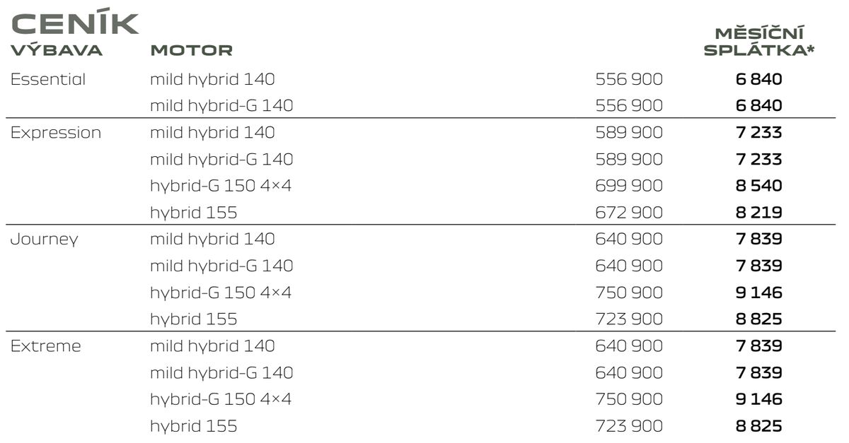 Bigster začíná s mild-hybridem 1,2 litru o 140 koních (103 kW) na částce 556 900 Kč, který můžete mít také s pohonem na LPG za stejnou cenu. Full-hybrid (HEV) 1,8 litru o výkonu 157,7 koně (116 kW) stojí od 672 900 Kč.