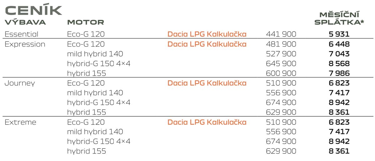 Nový motor kombinující pohon na benzin, plyn a elektřinu je k dispozici pro vyšší výbavy Expression a Extreme, u modelu Duster startuje od 645 900 Kč, u Bigsteru od 699 900 Kč. První objednávky budou dodány na jaře 2026.