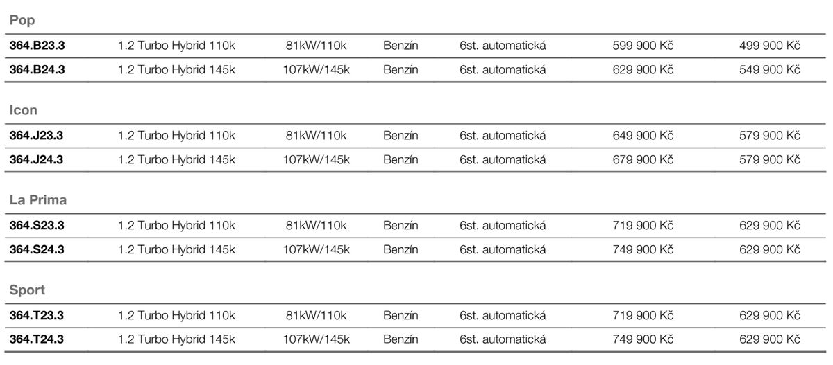 Model s výhradním pohonem předních kol přináší benzinový mild-hybridní tříválec 1,2 litru o systémovém výkonu 110 koní nebo 145 koní, vždy spárovaný s šestirychlostní automatickou převodovkou.
