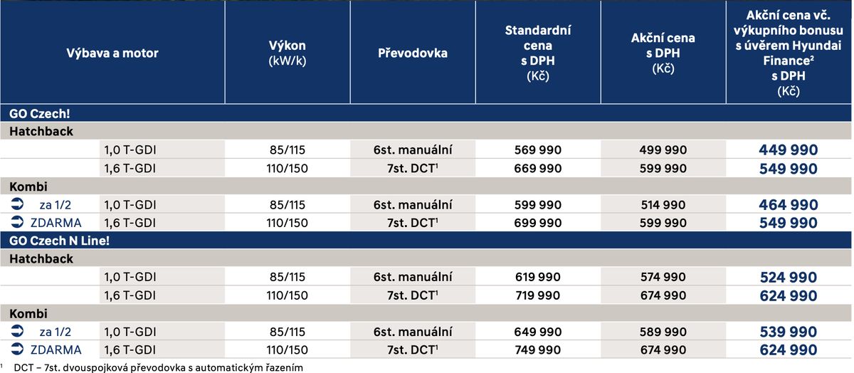 Ve stejném duchu „kombík za cenu hatchbacku nebo za půlku“ se kampaň týká také příjemně vybavené limitované edice i30 GO Czech!, kdy varianta s motorem 1,6 litru a automatem stojí od 549 990 Kč, zatímco litrový tříválec a manuál koupíte od 464 990 Kč.