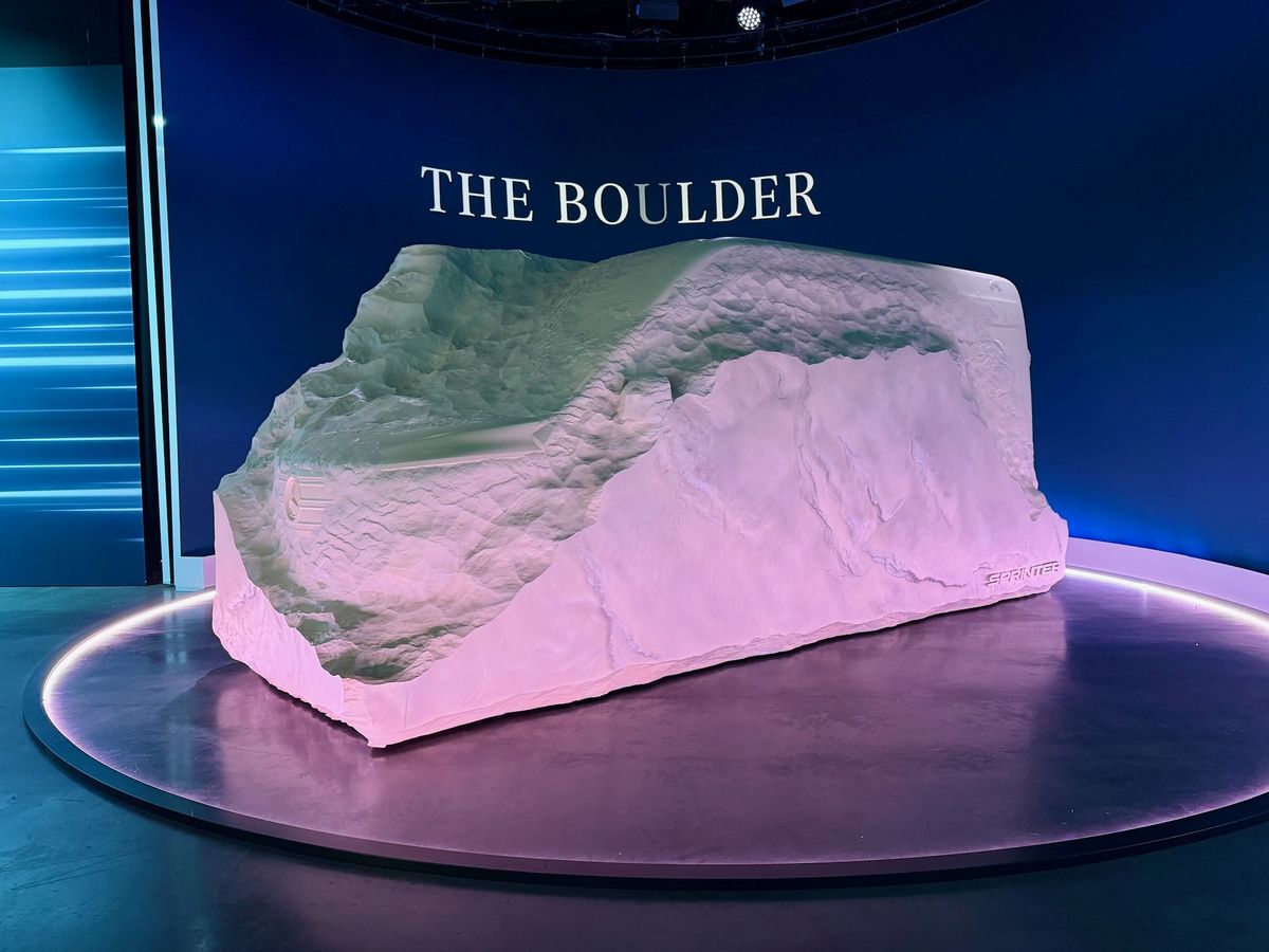 Teď v roce 2025 nám Mercedes ukázal koncept THE BOuLDER, což je vlastně socha o délce 650 centimetrů, výšce 275 centimetrů a šířce 250 centimetrů naznačující design i tvary čtvrté generace užitkového Spinteru. A kromě představení sochy nám zástupci značky něco málo pověděli.