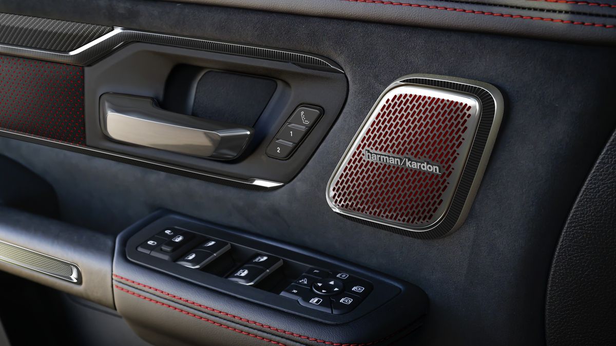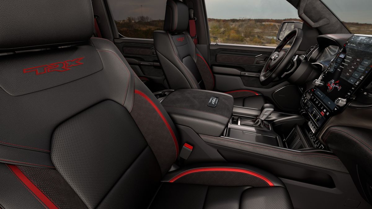 Uvnitř rexe mají své místo luxusní kožená křesla s elektrickým nastavením, masáží a výšivkami TRX, dále obložení z uhlíkových vláken, semišová stropnice, kožený volant a řadicí páka použitá v méně agresivní variantě RAM 1500 RHO.