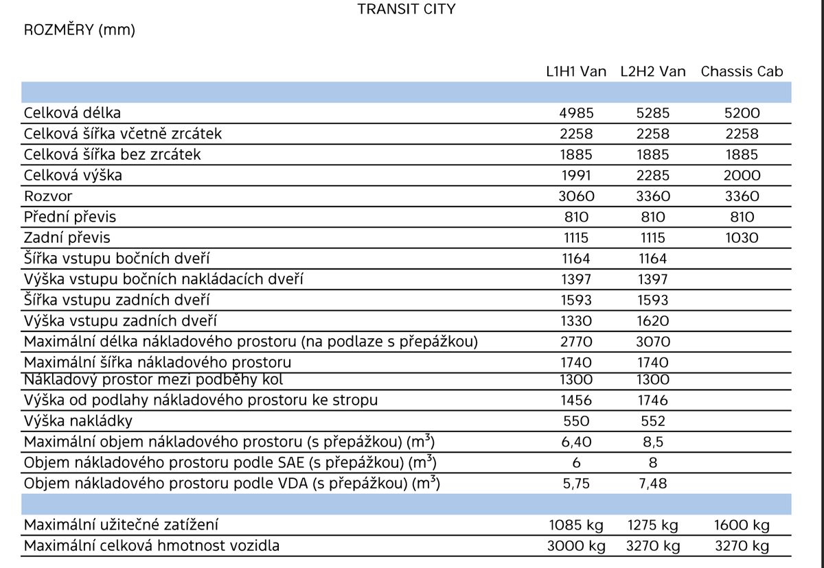 Technické specifikace modelu Ford Transit City.