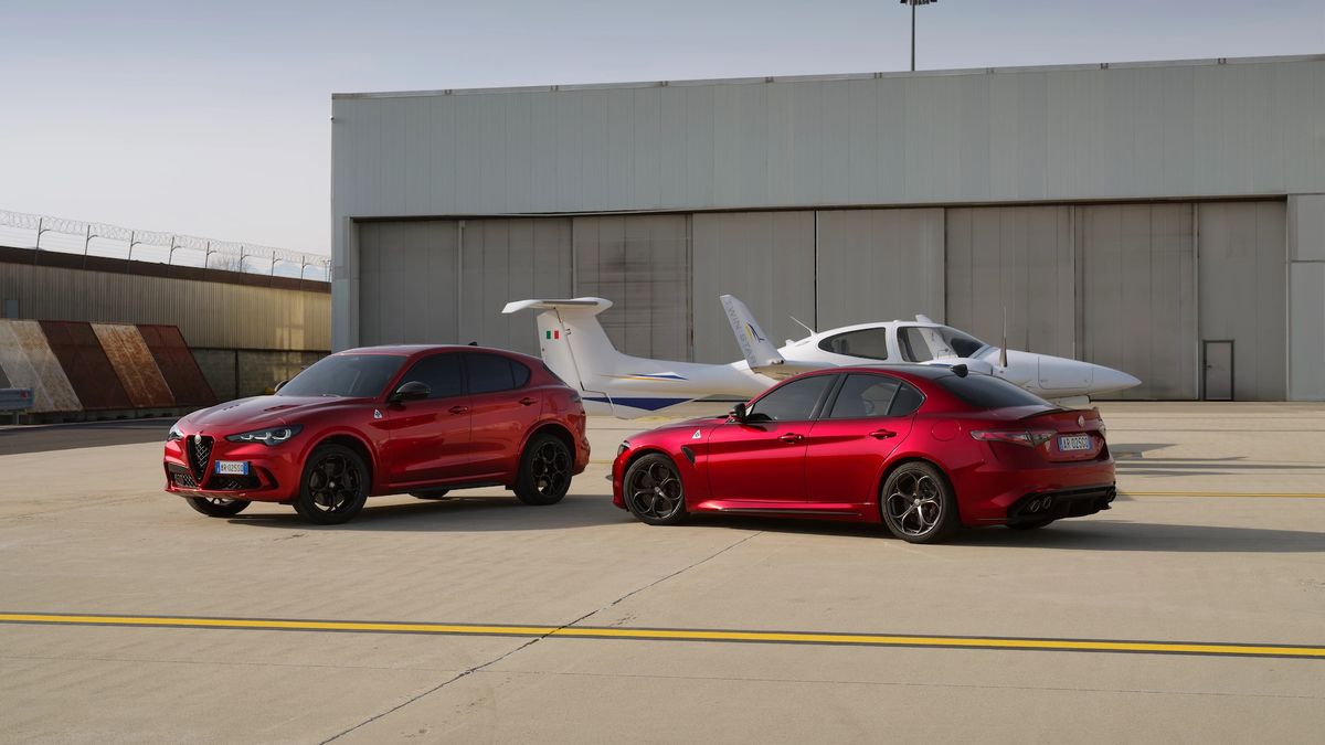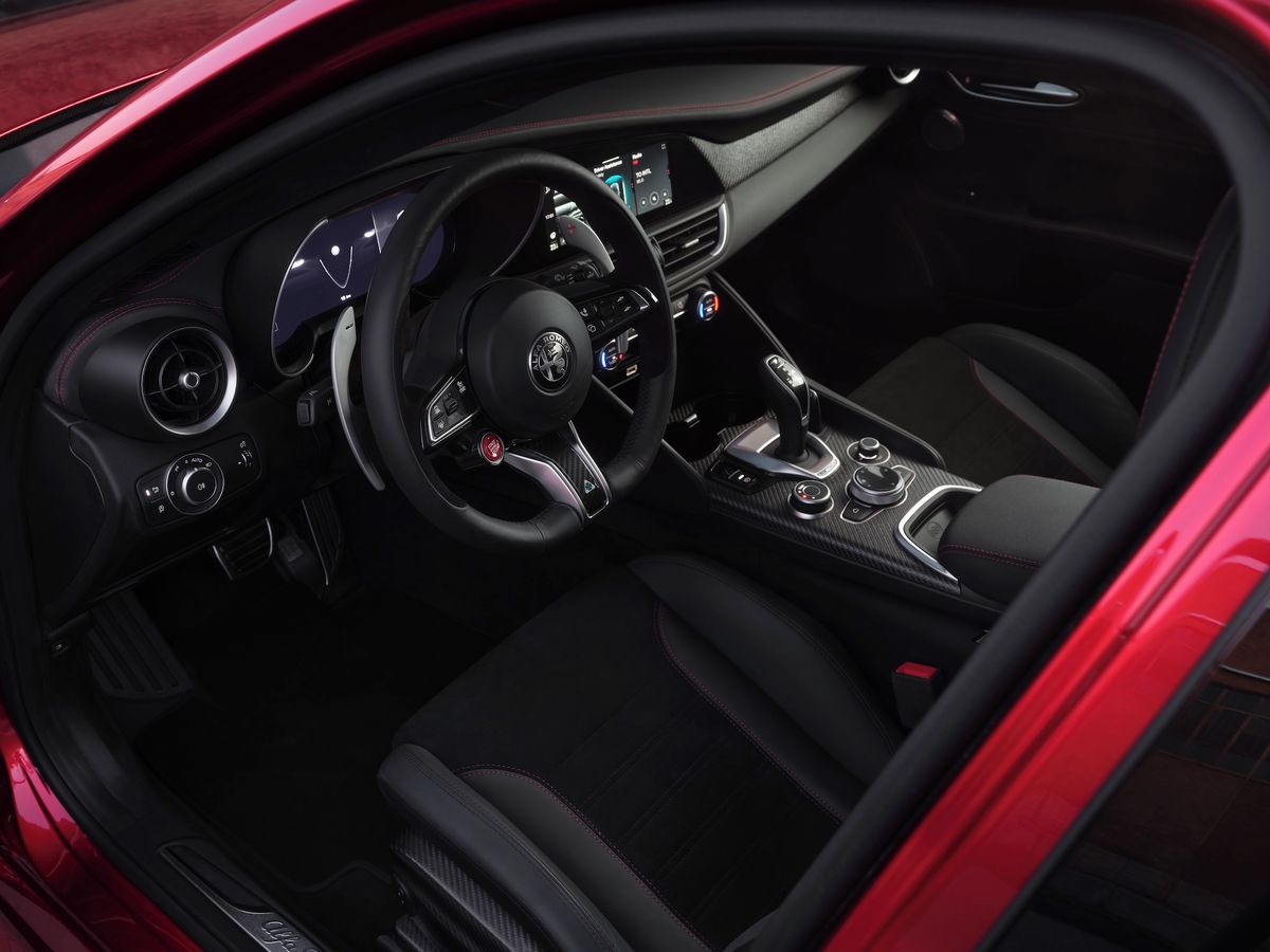 Sedan Giulia se ještě může pochlubit karbonovým aktivním předním splitterem, který zlepšuje stabilitu vozu. K tomu má vůz dostupná litá kola R19, zatímco Stelvio až R21. Titanový výfuk značky Akrapovič, umocňující sportovní charakter, je pak volitelnou výbavou pro oba modely, stejně jako karbon-keramické brzdy.