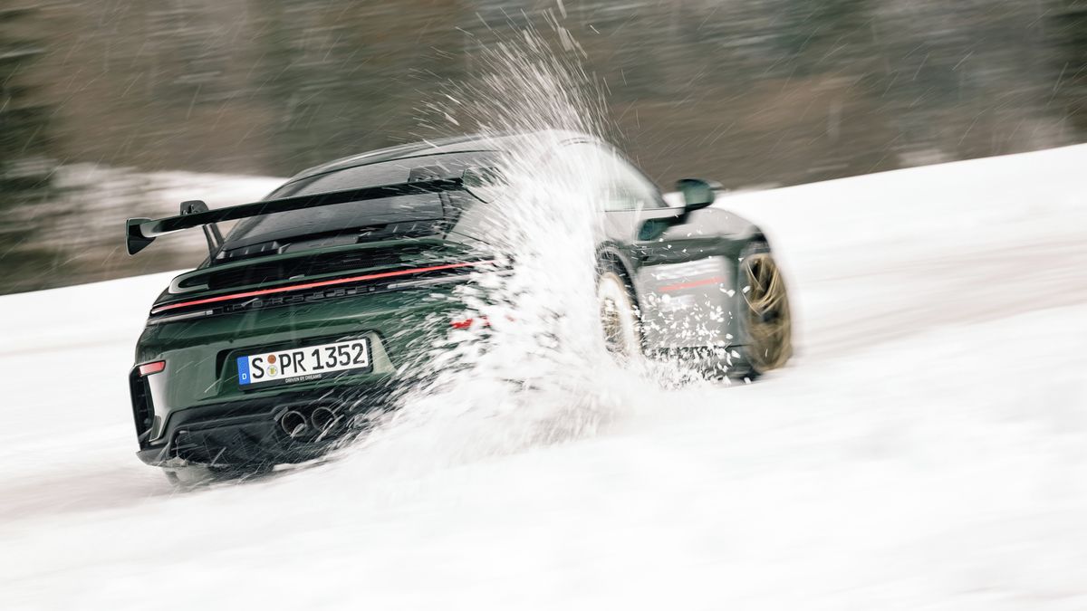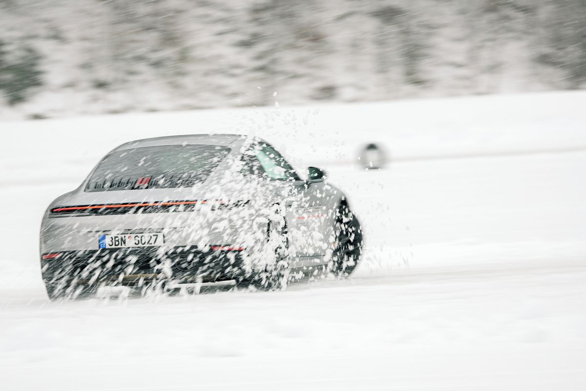 Přišlápnete plyn, záď se sklouzne bokem, volant se vám stočí v dlaních do kontra a sníh lítá na všechny strany. Úhel smyku určujete nohou na plynu – vrum, vruuum, VRUUUM – a volantem jen lehce korigujete a smějete se od ucha k uchu, jaká je to radost. Jo, smykovat na sněhu s 911 GT3 je přesně takové, jaké jste si to vysnili.