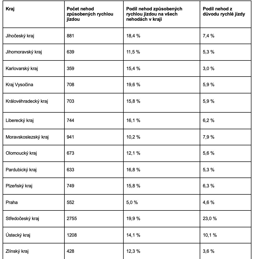 Z celkového počtu nehod tvořily ty způsobené nepřiměřenou rychlostí téměř pětinu všech událostí ve Středočeském kraji (19,9 %) a obdobně na Vysočině (19,6 %) či v Jihočeském kraji (18,4 %). Naopak v Praze šlo o pouhých 5 %, což je vzhledem k rychlostem v hlavním městě logické.