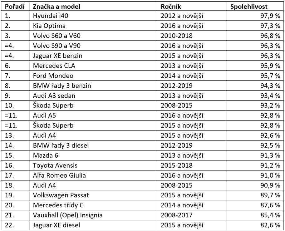 Prémiové značky by na prvních příčkách rády viděly své drahé modely, rybník jim však překvapivě vypálil Hyundai se svou i40 (97,9 %) těsně následovaný sourozencem v podobě modelu Kia Optima, na třetím místě skončilo Volvo řady 60. Zajímavé je, že poslední skončil Jaguar XE poháněný dieselovým motorem, jenže benzinová varianta byla naopak těsně pod stupni vítězů – to by vám mohlo pomoci s výběrem motorizace…