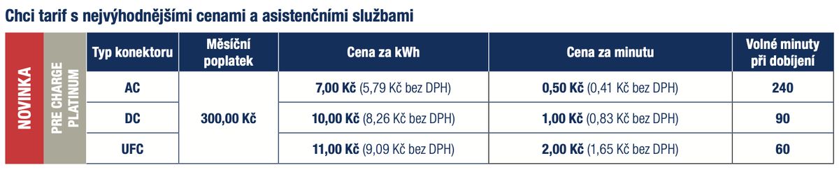 Z toho důvodu jsme zvolil tarif PRE Charge Platinum s měsíčním poplatkem za 300 Kč, který vedle výhodných nabíjecích cen obsahuje také asistenční služby (třeba výměna kola, porucha, vyproštění, odtah a jiné). Čtyřikrát do roka je lze využít bezplatně, konkrétně je hrazena práce technika v maximální délce 30 minut od jeho příjezdu.