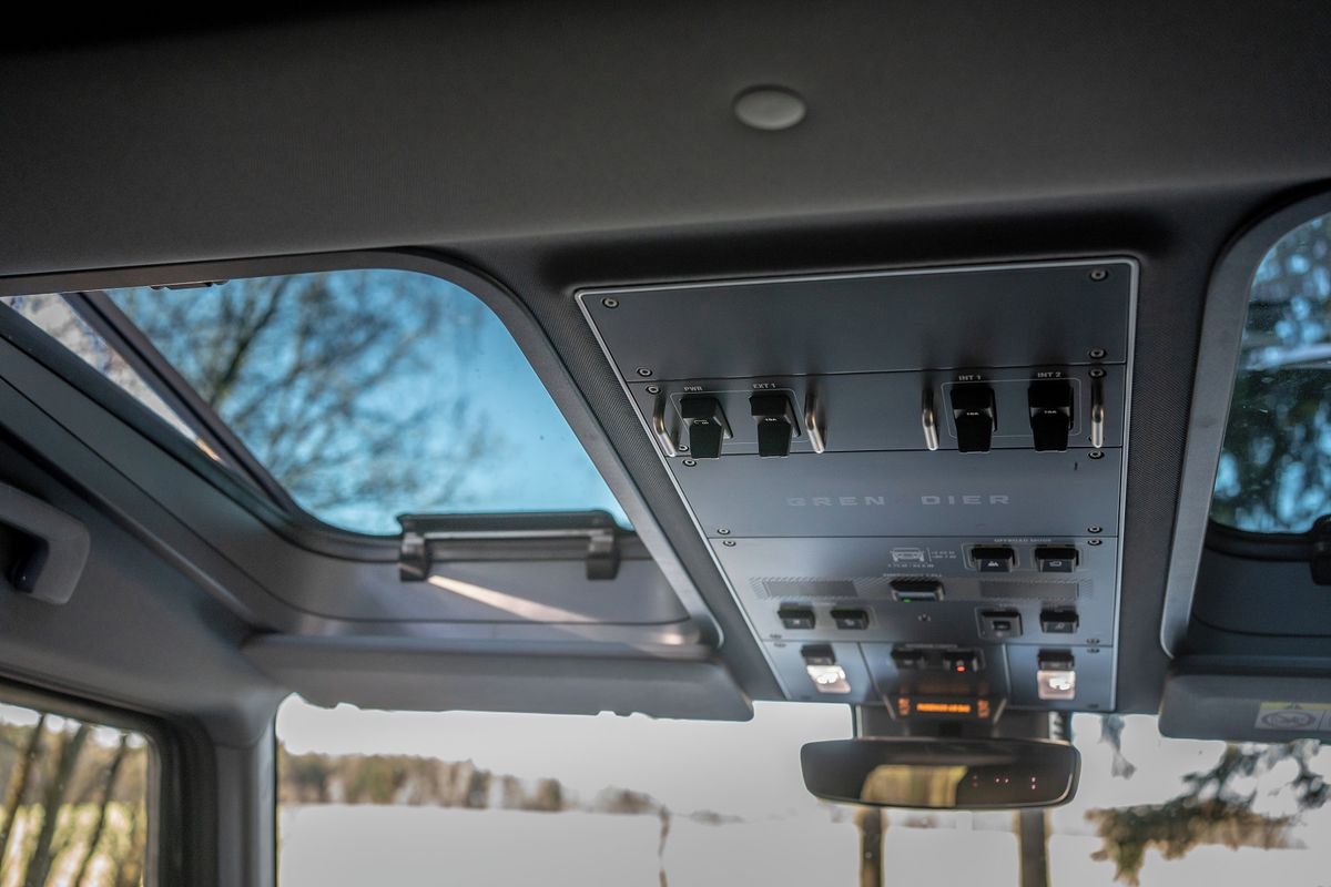 Zvenčí budete změny hledat ještě hůř. Nová jsou jen LED světla vpředu s kroužkem pro denní svícení a vzadu už bude u všech verzí parkovací kamera. Standardem je také NATO zásuvka a příprava pro naviják. Nová Black Series má černý lak, černá kola a tmavé detaily, objevily se ale i jiné nové barvy. Auto je zvenku stále nepřehlédnutelné a převyšuje nejen běžné osobáky, ale i konfekční SUV. Nad řidičem a spolujezdcem mohou být - a u tohoto exempláře skutečně jsou, otevíratelná okna. Bohužel stále nemají žádné clony, takže když pálí sluníčko v přímém úhlu, nemáte se před ním jak schovat. Když si s něčím v autě neporadíte, má Grenadier hlasového asistenta na bázi ChatGPT. Takže už není potřeba číst příručku.