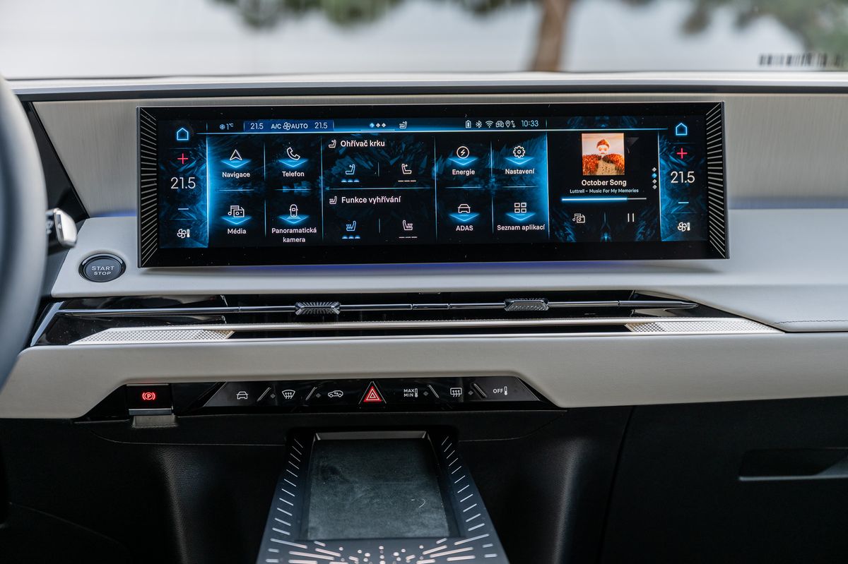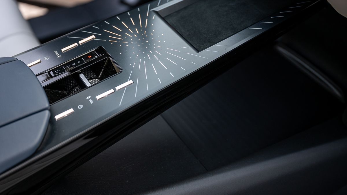 Jakožto řidiči oceňujeme i přes výrazný avantgardní design zachování fyzických ovladačů na volantu, líbivě podsvíceném středovém tunelu, levé části interiéru a pod dlouhým displejem infosystému.