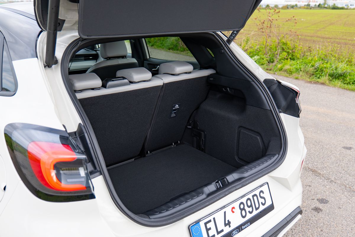 Instalace baterií si taky vynutila zvýšení podlahy, což omezuje prostor pro posádku vzadu, kam už se dospělák spíš moc nevmáčkne. Na druhou stranu odebrání výfukového potrubí umožnilo zvětšit odkládací schránku pod podlahou kufru, 81litrový MegaBox se tak přifoukl na 145litrový GigaBox (stále má šikovnou odvodňovací zátku), což je příjemný bonus k 378litrovému kufru.
