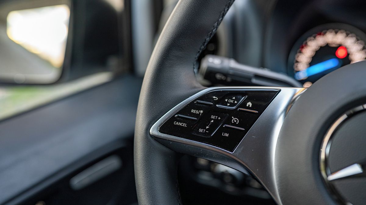 Ačkoli v kabině převažují plasty, jde o na pohmat robustní materiály. Palubní desku inspirovanou osobáky zdobí kulaté výdechy topení, které jsou u Mercedesu stále v kurzu. Potěšil nás kůží potažený volant s pádly pro regulaci rekuperace, jednak kvůli dostupnému výhřevu a také proto, že jeho věnec není zbytečně velký a široký, jak to u benzů občas bývá.