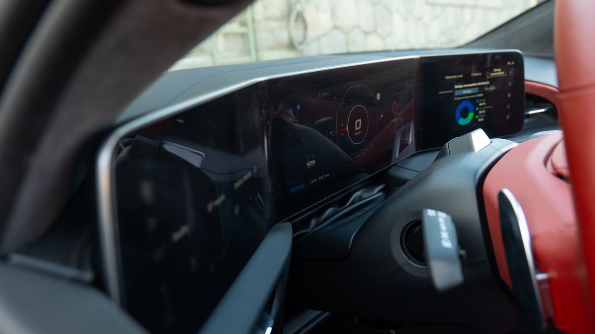 Dominantou kabiny jsou čtyři displeje, které sice na pohled vypadají fantasticky a skutečně máte pocit, že řídíte něco z videohry Cyberpunk 2077, ale v praxi už to taková pecka není.