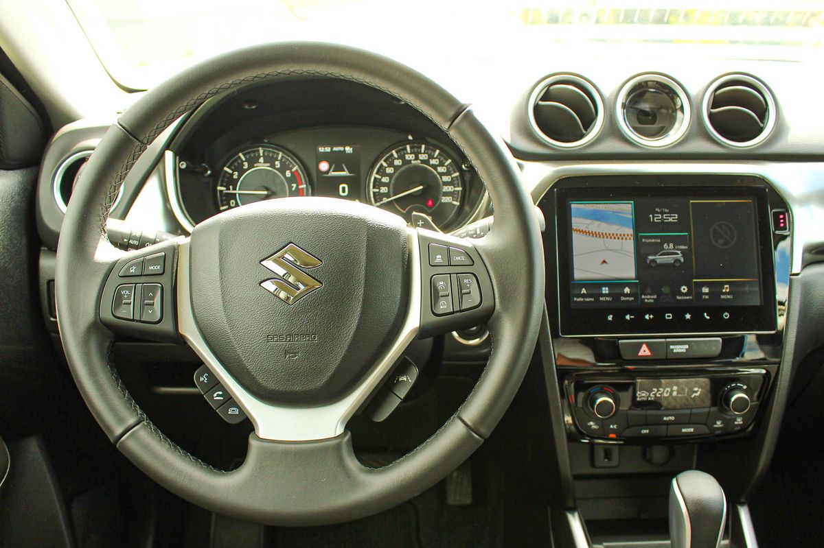 Přestože Vitara za těch 10 let na trhu prošla dvěma modernizacemi, uvnitř je její věk jasně znát. Někdy v dobrém, jindy v horším. K pozitivním vlastnostem patří například přítomnost fyzických ovladačů pro většinu důležitých funkcí významně zpříjemňujících ovládání, nebo infotainment, který toho moc nedokáže, ale zato potěší přehledností. Navíc umí bezdrátově Apple CarPlay a Android Auto. Fajn je také přehledný přístrojový panel s pěkně čitelnými analogovými budíky a malým displejem palubního počítače.