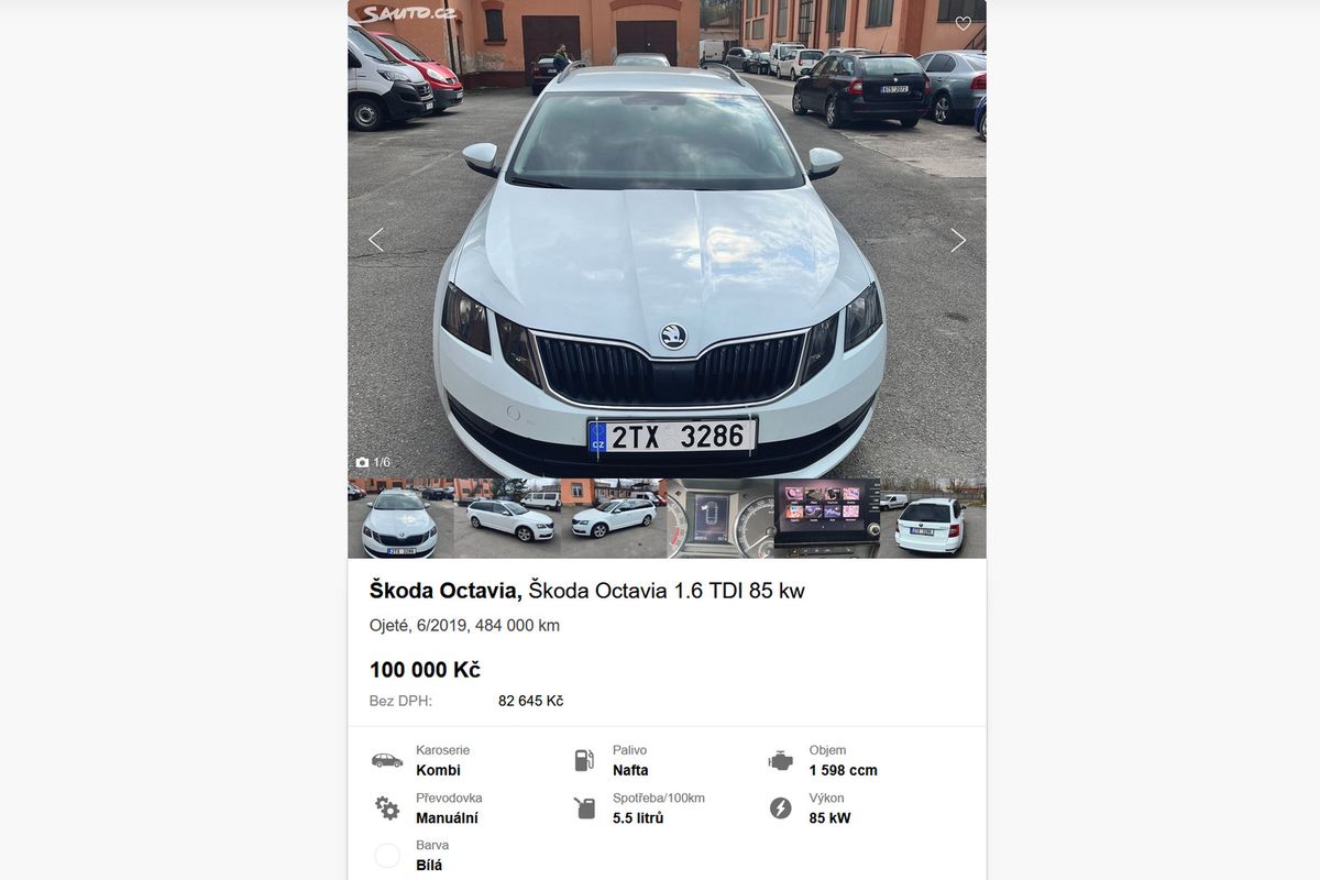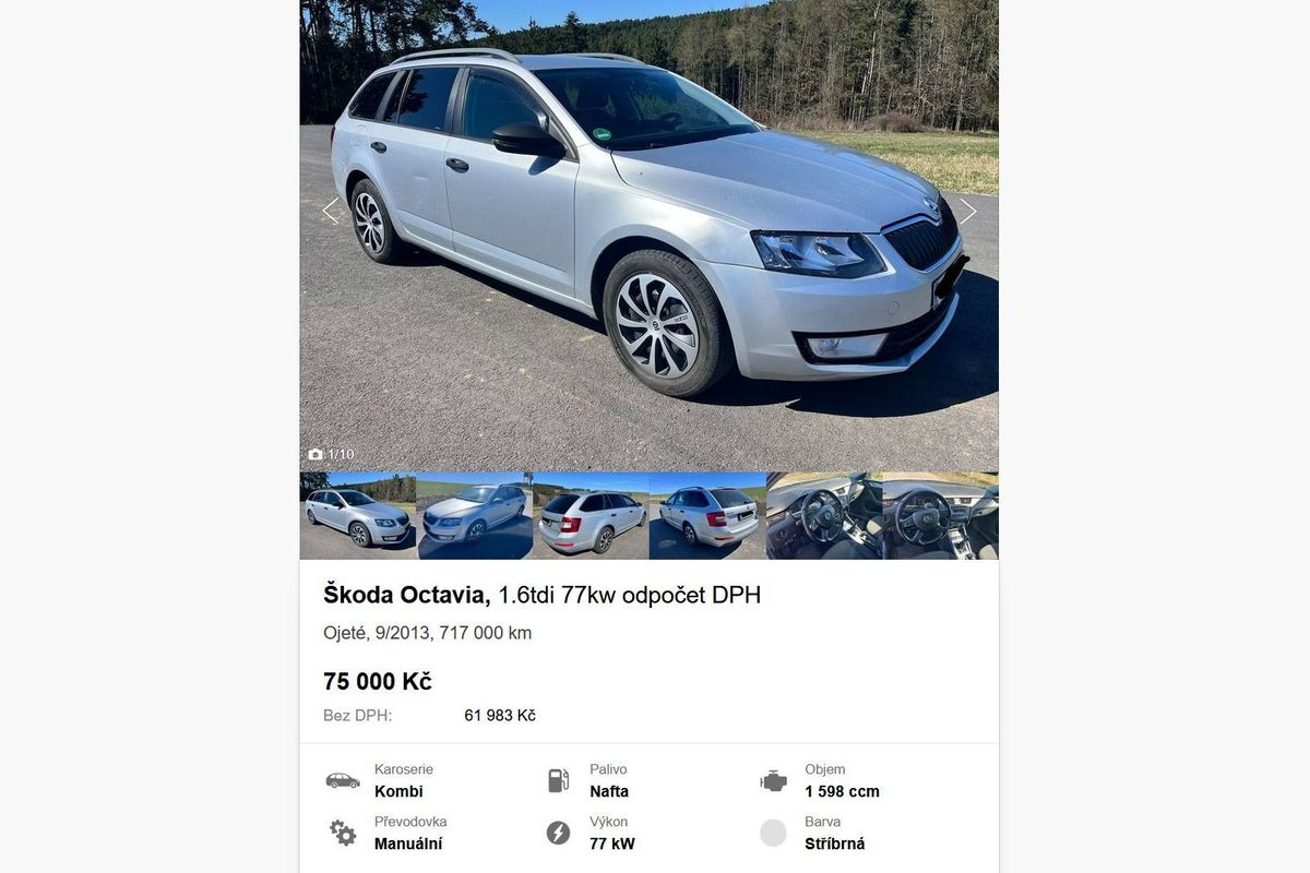 Tohle je aktuálně nejvíc ojeté auto v inzerci na webu sauto.cz (pokud vynecháme očividně chybně vyplněné inzeráty). Prodávaná Octavia z roku 2013 má motor 1.6 TDI o výkonu 77 kW (verze CLHA), manuál a pohon předních kol. Pořád u ní lze odečíst DPH. Z testů (a vlastních zkušeností) víme, že Octavie III umí být neuvěřitelně odolní dělníci, a to i při ne zrovna ukázkovém přístupu k údržbě.