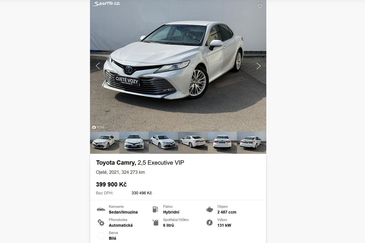 Hybridní toyoty jezdí hodně, ale v nabídce extrémně ojetých aut se zas tak často nevyskytují. Inzerovaná Toyota Camry s hybridním pohonem je v provozu od března 2021, dle všeho byla poprvé registrována v Česku a STK má platnou do března 2027. Je na prodej za docela odvážných 399 900 Kč a lze si odečíst DPH.