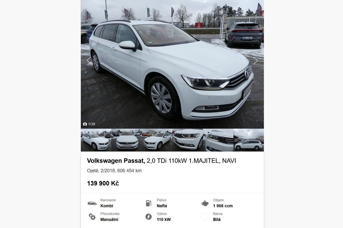 Nabízený Passat je za 139 900 Kč a vlastně je jen potřeba pohlídat servisní historii a kdy se naposledy dělaly rozvody (mají se měnit po 210 000 km, takže buď už má auto čtvrté, nebo ho další výměna preventivně čeká). Pozor na netěsnosti oleje a také na stav emisních systémů. Částicový filtr stojí hrozivých 85 518 Kč, druhovýrobní alternativa přijde stále na mastných 43 tisíc. To je ale na tak ojeté a vlastně levné auto dost peněz.
