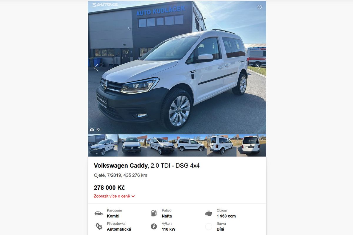 Volkswageny Caddy mezi hodně ojetými auty najdeme také často, ale spíše nákladní verze než tyto osobní. Nabízené auto je v provozu od července 2019 a údajně je po prvním majiteli z Rakouska a má servisní knížku. Prodejce za něj chce 278 000 Kč, což je docela dost. Ale vůz je mladý a podle fotek vypadá velmi zachovale. Potvrzuje se, že volkswageny umí velmi dobře maskovat svůj reálný nájezd, takže se není co divit, že byly vždycky oblíbeným cílem podvodníků.