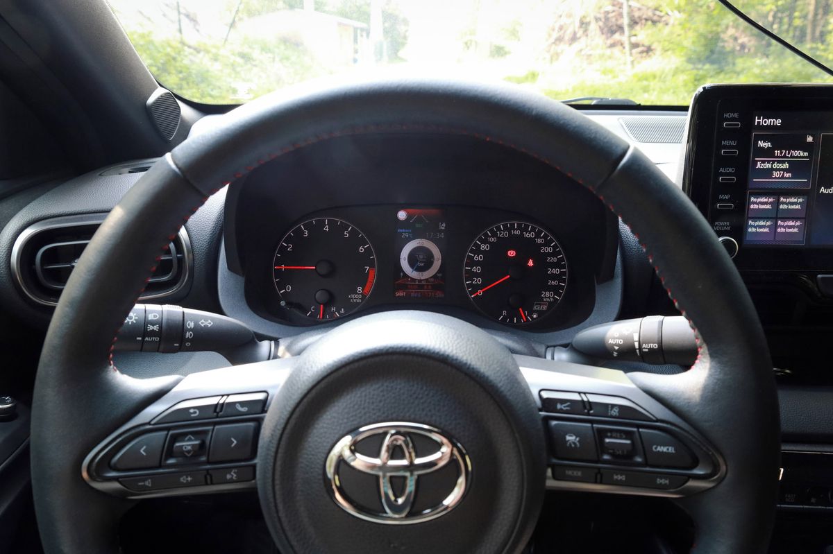 I když je GR Yaris zaměřený hlavně na jízdní výkony, nabízí i bohatou výbavu obsahující palubní počítač, bezklíčové odemykání, infotainment se systémy Apple CarPlay a Android Auto, multifunkční, vyhřívaný a nastavitelný sportovní volant, úžasná sportovní, ale současně vyhřívaná sedadla s perfektním bočním vedením, černé čalounění stropnice, adaptivní tempomat, automatickou klimatizaci, full-LED světlomety a parkovací senzory. Palubní deska je prakticky stejná jako v běžném Yarisu, vybočuje tu jen plaketka s informací, že auto vzniklo dle regulí FIA o homologaci. Vadí mi, že tu není ukazatel teploty motoru, jen kontrolka, která po ohřátí zhasne. To je u sportovního auta nedostatek.