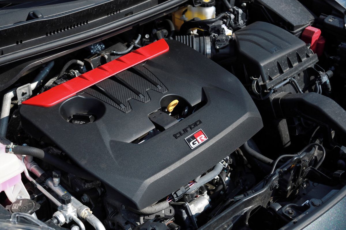 Pod kapotou je řadový tříválec G16E-GTS s přímým vstřikováním a systémem VVT-i, objemem 1 618 ccm a přeplňováním turbodmychadlem. Výkon je 261 koní (192 kW) v 6 500 otáčkách a točivý moment 370 Nm ve 4 000 otáčkách. Musíte si tedy dojít nahoru k červenému poli a nečekat kopanec ve středním pásmu otáček. Zvuk, tím myslím ten opravdový, není nijak dechberoucí. Toyota vám chce lepší, dunivý a připomínající Corvette posílat do repráků. S motorem je spárovaný šestistupňový manuál EA67F. Ten má nádherně mechanický chod a je naprosto precizně přesný. Jelikož budete řadit hodně, určitě to oceníte. Maximální rychlost je elektronicky omezená na 230 km/h, ale stovku auto pokoří už za 5,2 sekundy. Ano, po uvedení GR Yarisu výrazně ubylo posměšků na tříválcové motory. I ten typický zvuk zde přehluší sportovní výfuk.