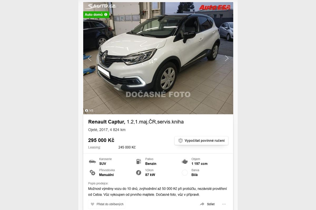 Zájemci o kompaktní SUV určitě zbystří nad tímto Renaultem Captur z roku 2017, který zatím neujel ani pět tisíc kilometrů. Na prodej je teď v Esách za 295 000 Kč. Není to málo, ale zas to bude auto prakticky ve stavu nového vozu. Prohlídku ovšem nepodceňujte a ověřujte, jestli je všechno v pořádku. I zde by podle záznamů z STK měly kilometry sedět.