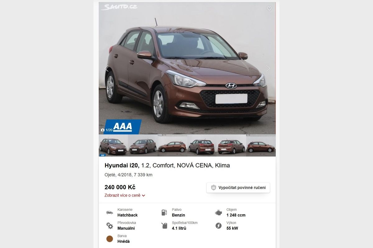 Kompaktní auta korejských značek se mezi velmi málo ojetými kusy objevují poměrně často. V „áčkách“ inzerovaný Hyundai i20 má zatím najeto jen 7 339 km, je z roku 2018 a na prodej je za 240 000 Kč. Nová i20 teď stojí v akci od 335 tisíc, ale v této kategorii trhu je sto tisíc korun obrovský rozdíl.