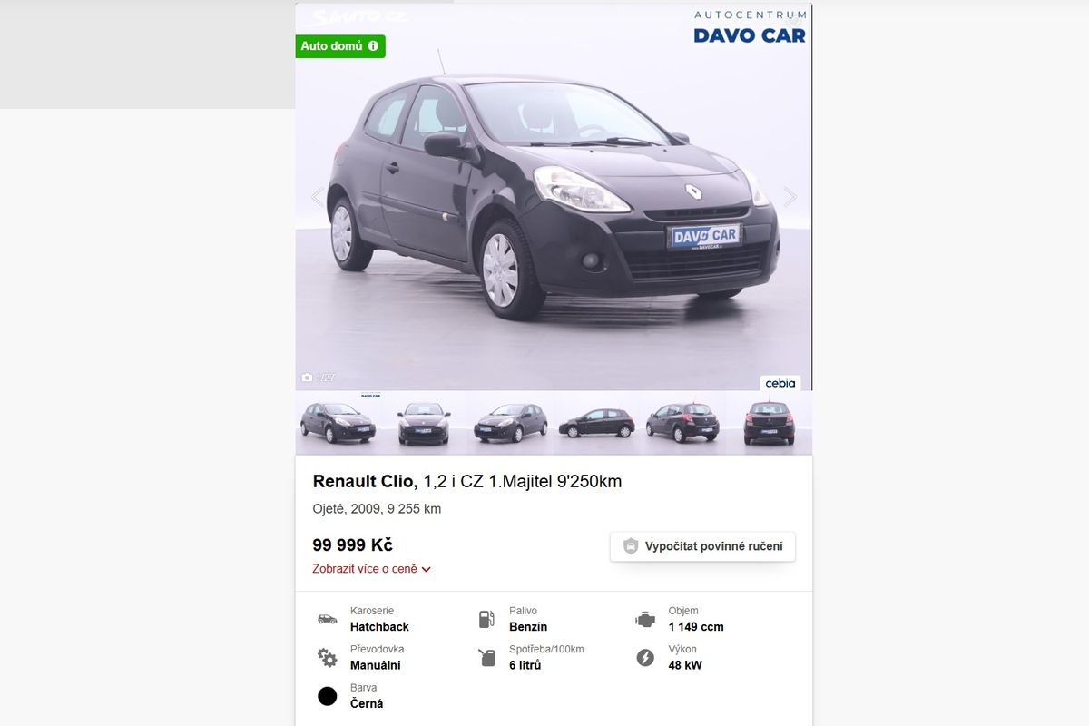 Další kousek je Renault Clio z roku 2009, který ještě nenatočil ani deset tisíc kilometrů. Ročně zatím ujel v průměru jen 578 km. Vůz je českého původu, po prvním majiteli a aktuálně je na prodej bez koruny za sto tisíc. Na rozdíl od většiny utahaných ojetin nebude trpět na typické projevy zanedbaných aut s vysokými nájezdy.