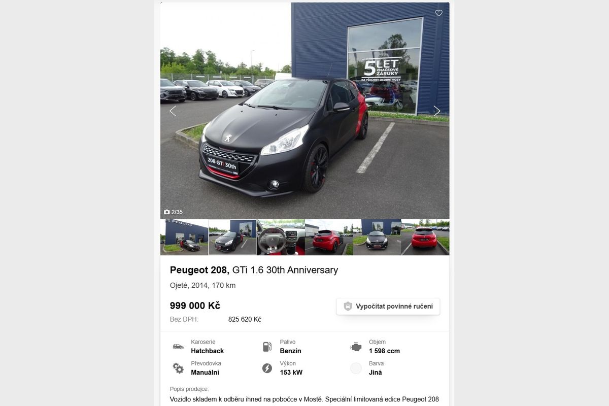 Hned na úvod to „odpálíme“ zajímavostí. Rychlým sportovním Peugeotem 208 GTI v limitované edici. Je k dispozici u prodejce v Mostě a od roku 2014, kdy byl vyroben, má najeto pouhých 170 km. Dle všeho tomu tak opravdu je. Za posledních 11 let tak ujel průměrně jen 15 km ročně. Prodejce za něj ale chce 999 000 Kč, což není zrovna málo. Peugeot 208 GTI je sice zajímavá a zábavná hračka, ale už je na vás, jestli vám za to stojí.