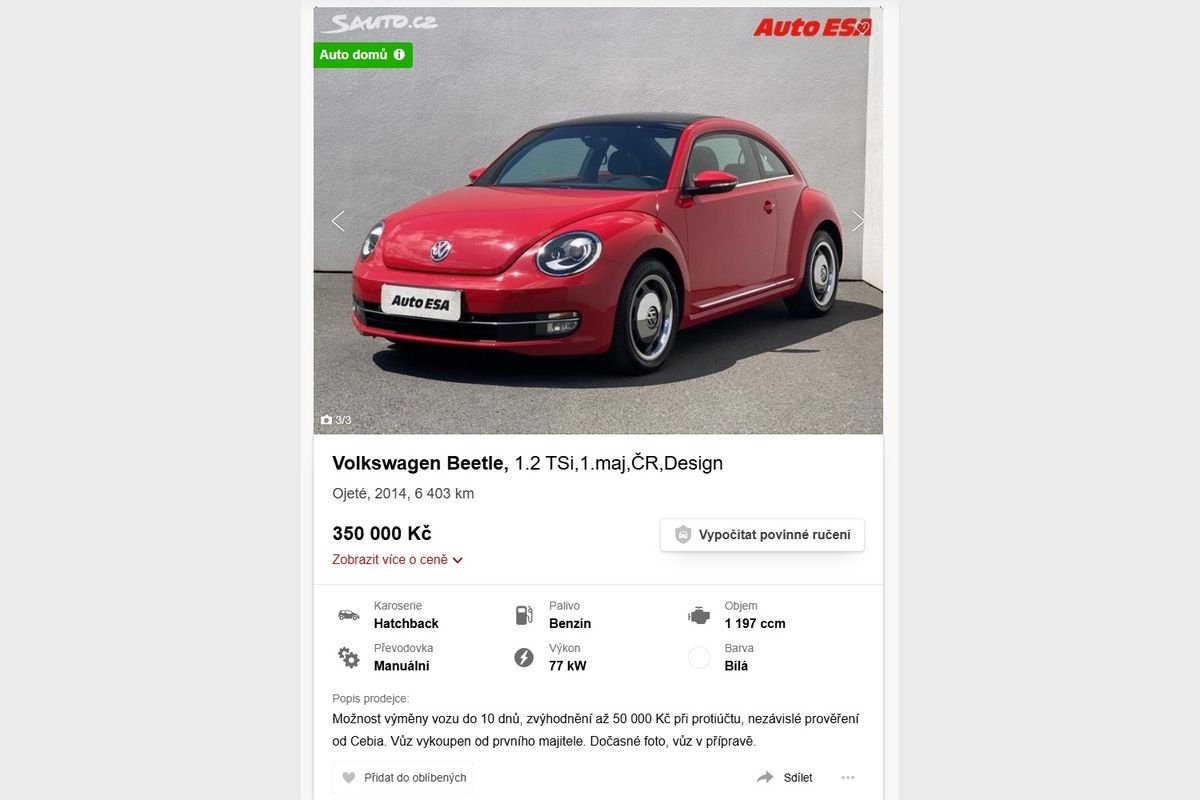 Dalším málo ojetým volkswagenem v nabídce je Beetle druhé generace. V Auto ESA, kde si půjčujeme testovací auta, chtějí za tuto stylovku z roku 2014 částku 350 000 Kč. Není to málo, ale Beetle byl i jako nový drahý a ve světle podobných aut a dnešních cen je to vlastně za hubičku. Navíc tento Beetle druhé generace vůbec není špatné auto, i když osloví spíše někoho, kdo jezdí sám nebo maximálně ve dvou.