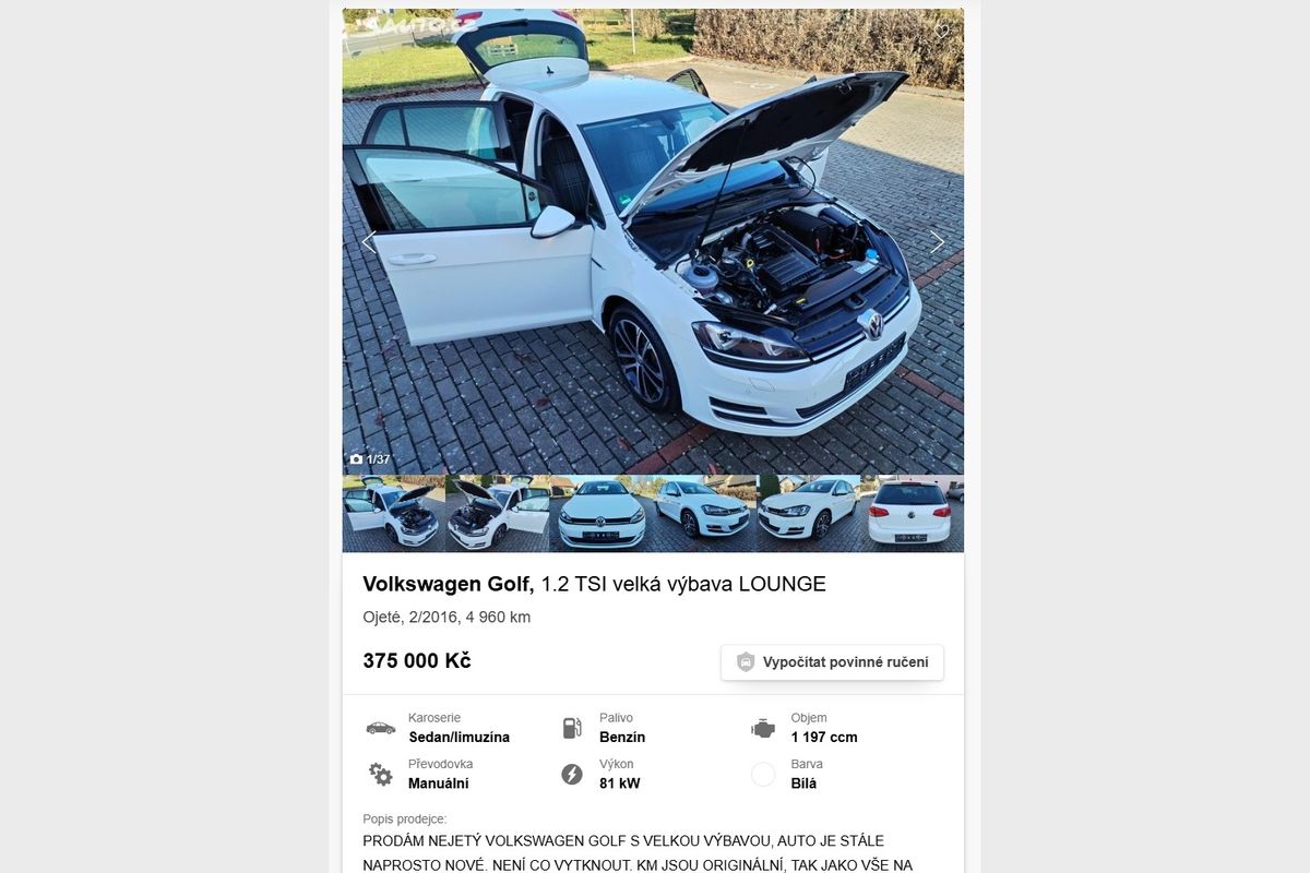 Tohle je jediné auto, u kterého si dejte na historii obzvláště velký pozor. Je to evidentně dovoz a u takových se dá s tachometrem hezky kouzlit. Ale podle fotek vypadá auto moc pěkně, takže za úvahu rozhodně stojí. Golf z roku 2016 má ještě skvělý motor 1.2 TSI (81 kW), najeto jen necelých pět tisíc kilometrů a prodejce za něj chce 375 000 Kč. Jen pro zajímavosti, základní Golf 1.5 TSI 85 kW dnes stojí 678 000 Kč.