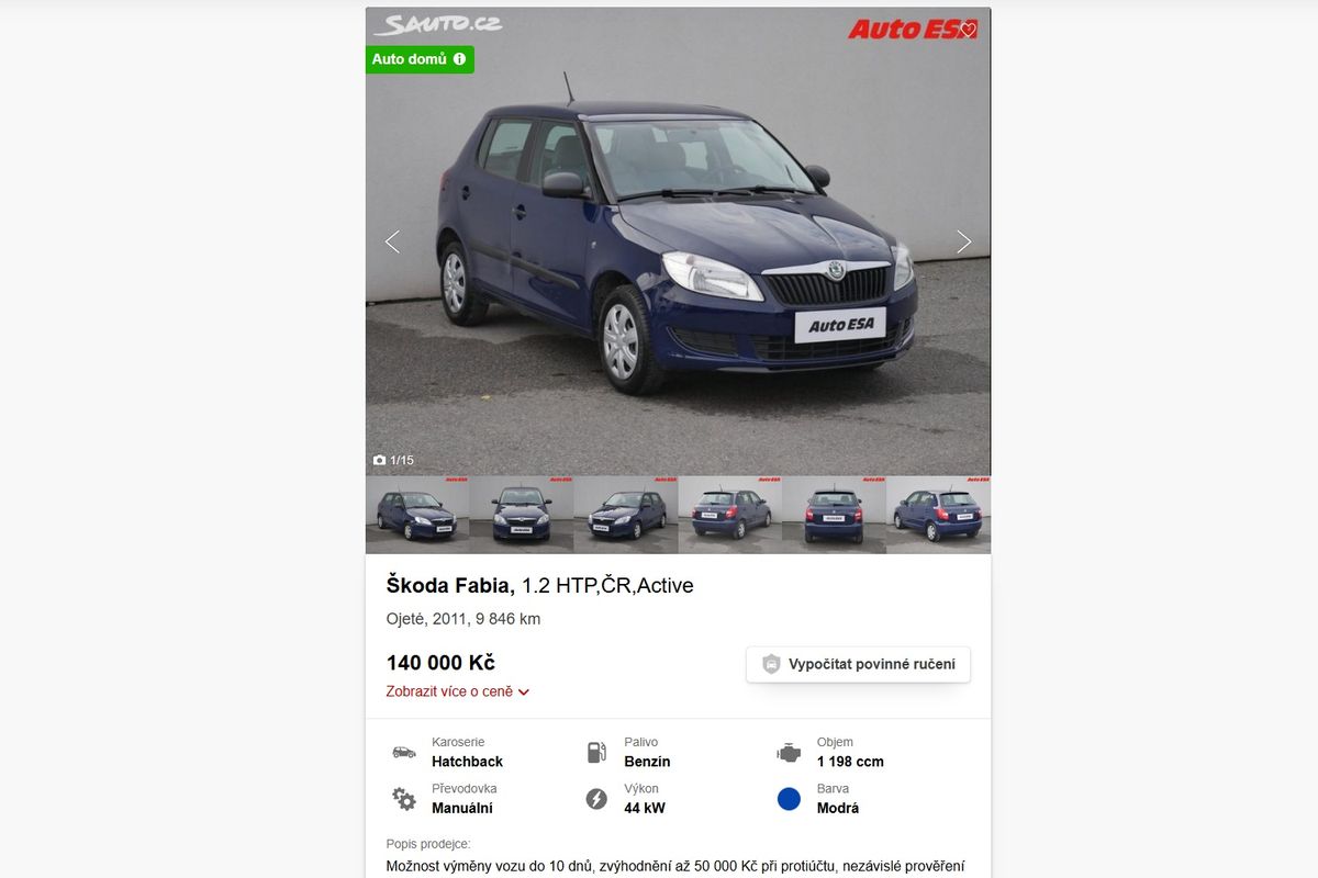 Do naší desítky málo ojetých aut se vejde i legendární „haťapka“, tedy Fabia s motorem 1.2 HTP, v tomto případě v základní verzi 44 kW. Kus druhé generace po faceliftu je v provozu od roku 2011 a zatím neujel ještě ani deset tisíc kilometrů. Prodejce za něj chce 140 000 Kč. Nutno říci, že tato Fabia v naprosté holotě bez rádia a klimatizace je svým způsobem roztomilý svědek doby, jaká auta si lidé za své vlastní peníze kupovali.