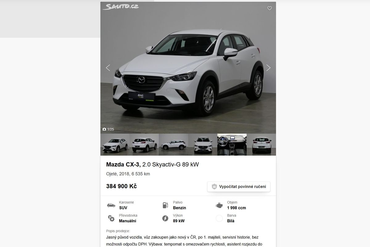 Tohle už je trochu novější auto, ale pořád má najeto velmi málo. Od roku 2018 mu na tachometru přibylo zatím jen 6 535 km. Vůz by měl být českého původu a po první majiteli. Teď je na prodej v Praze za 384 900 Kč. Současná Mazda CX-30 stojí od 708 000 Kč, takže zase můžete mít prakticky nové auto za polovic.