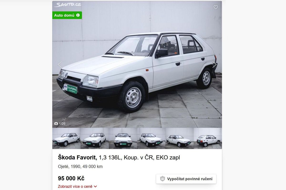Vždycky se nám lidé smáli, když jsme říkali, že jednou i z Favorita bude sběratelský exemplář. A je to tady. Původní verze s asymetrickou maskou opravdu začíná být žádané zboží a inzerované kousky dokazují, že cena už nikdy neklesne. Naopak. Tento je z roku 1990, najeto má prý jen 49 000 km a na prodej je za 95 000 Kč. Ano, všichni si pamatujeme dobu, kdy jsme nějakého zuboženého „fakana“ koupili za lahev rumu a pak s ním dováděli na poli za vsí, dokud se nepřevrátil a nezadřel (a že to dalo práce!).