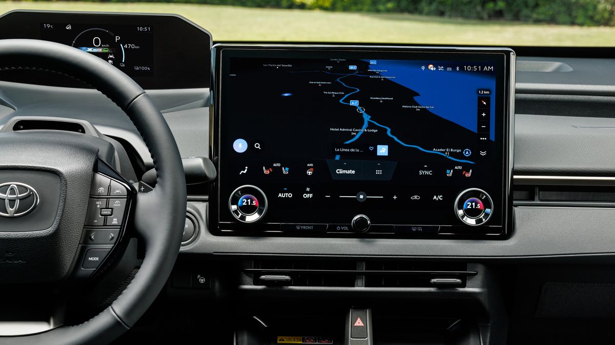 Uvnitř jsem byl z tohoto pohledu spokojenější, zde se bZX4 posunulo víc. A posunulo se směrem k Lexusu, z luxusnější divize Toyoty si modernizované bZ4X vypůjčilo kompletní uspořádání displeje infotainmentu s úhlopříčkou čtrnáct palců. A hlavně odděleným panelem pro ovládání ventilace, teplotu pak regulujete úplně samostatnými ovladači. Jednoduché, uživatelsky přívětivé, děkuji… a budoucí uživatelé bZ4X budou jistě rádi za „elektromobilní“ navigaci – trasu si tak budete moct naplánovat s ohledem na stav nabití a dostupné nabíječky. Tohle předchůdce neuměl. Velmi důležitý předehřev potom můžete taky nechat na toyotě, aby si jej naplánovala sama (podle té navigace…), nebo funkci aktivujete manuálně. Znovu hodně důležitá novinka.