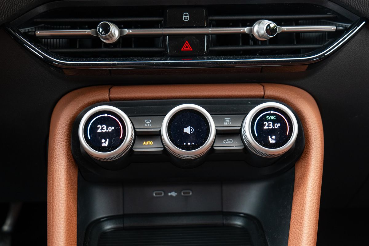 Ke zmíněným Smart Dials, tedy těm „simply clever ovladačům“. Ano, to jsou ta tři kolečka uprostřed, kterými budete nejčastěji ovládat ventilaci. Krajními ale také vyhřívání sedaček, případně jejich ventilaci. Je to úplně jednoduché – ovladač zmáčknete jednou, objeví se vyhřívání sedaček, otočením pak zvolíte intenzitu. To samé platí pro ventilaci sedaček, pouze musíte na začátku kolečko zmáčknout dvakrát. Prostřední ze Smart Dials je ještě multifunkčnější – ovládá třeba hlasitost multimédií, intenzitu proudění vzduchu, jízdní režimy, umí také přiblížit mapu na hlavním displeji… Zkrátka, co si na prostřední ovladač nakonfigurujete.