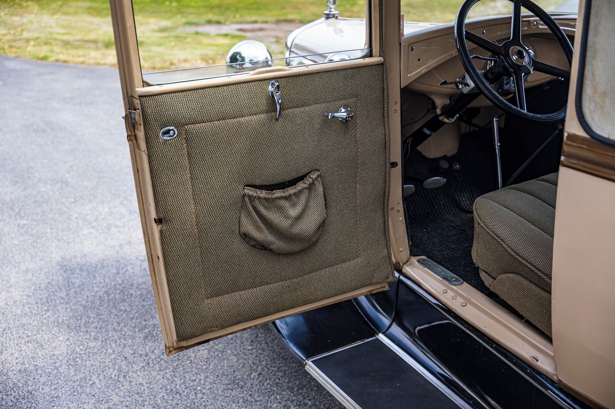 Interiér je strohý, ale má hezký čtyřramenný volant a klasický přístrojový panel ve tvaru diamantu uprostřed palubky. Za volantem se sedí docela slušně, samozřejmě s tím, že volant i pedály jsou blízko. Připomínám si šestiválcovou Škodu 645, o které jsem tady také psal, než se prodala na aukci Retro Garáže. Ta měla sice mnohem zdobnější interiér, ale ještě měla „špatně“ pedály, takže řízení bylo složitější. Ford Model A už má pedály tak, jak jsme zvyklí, a navíc má volant normálně vlevo, takže ruka je na řadicí páce přece jen jistější. Samotné startování je mechanický obřad, kde je řidič dirigentem benzinu, vzduchu a elektřiny.