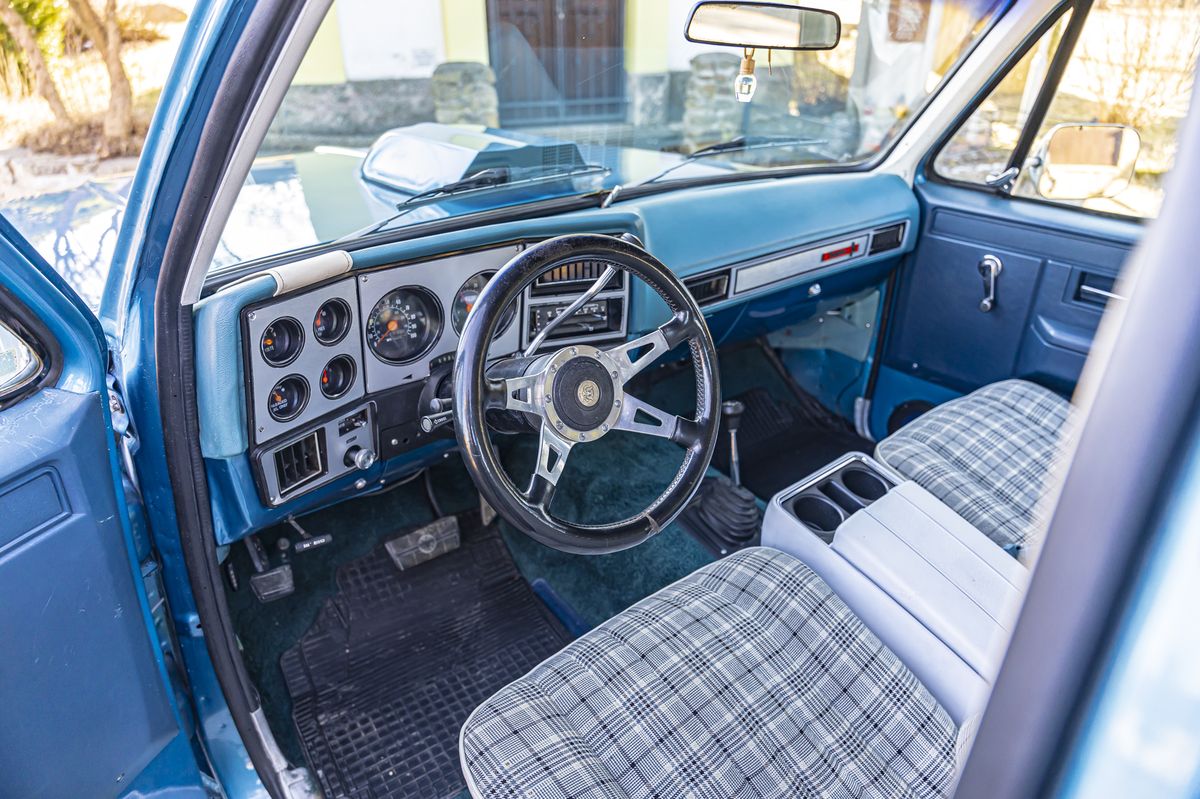 Testovaná verze přitahuje na první pohled, protože je z dnešního pohledu prakticky ideálním zástupcem druhé generace K5 Blazeru. Má totiž výrazné dvoubarevné lakování karoserie, což je u těchto aut vždycky zajímavé. Stupeň výbavy Cheyenne stál nad základní verzí Custom Deluxe a pod vrcholnou Silverado, takže šlo o takový zlatý střed – byl dostatečně odolný na práci a zároveň dostatečně hezký a vybavený, aby se v něm dalo v neděli vyrazit do kina.