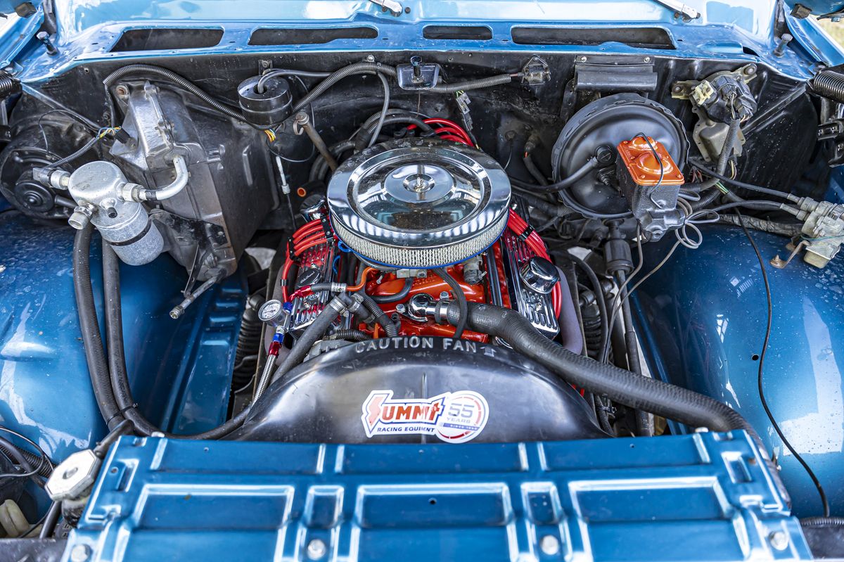 Vnitřní prostor by člověk ještě zkoumat ještě chvilku vydržel, ale cítím, že už je čas na jízdu. V našem případě pod kapotou pracuje legendární small-block 5,7 litru V8 s oranžovým blokem, známý americkým označením objemu v kubických palcích jako 350tka. Proti sérii doznal určitých úprav, místo plechového hrnce vidíme otevřený, chromovaný filtr, pod kterým sedí čtyřkomorový karburátor. Další úpravy naznačují červené tlusté kabely ke svíčkám s bezkontaktním zapalováním, ale i vylepšená palivová soustava. Celek dotvářejí i další úpravy, kromě viditelných vík ventilů Edelbrock a hliníkového sání se sahalo i do útrob odolného pushrod masivu.