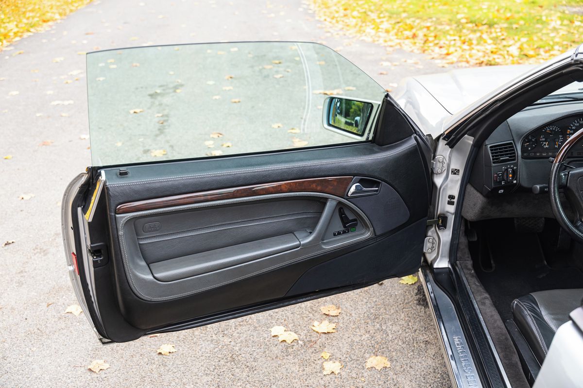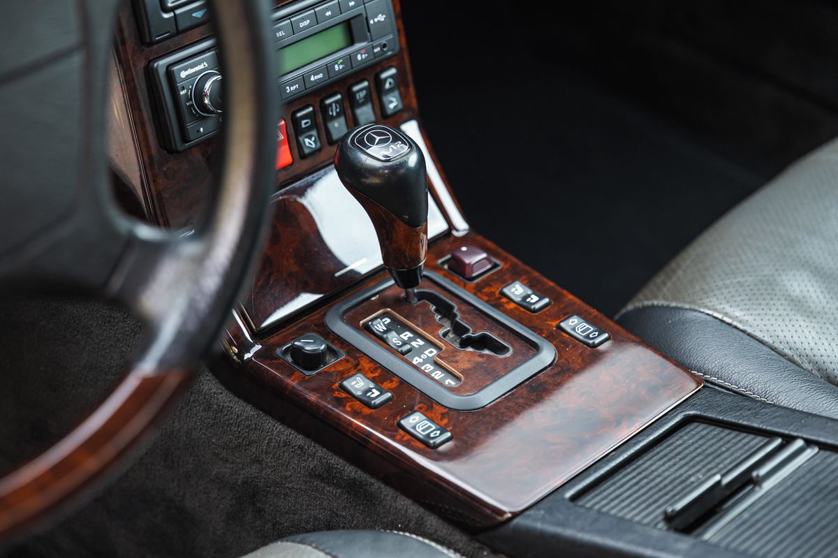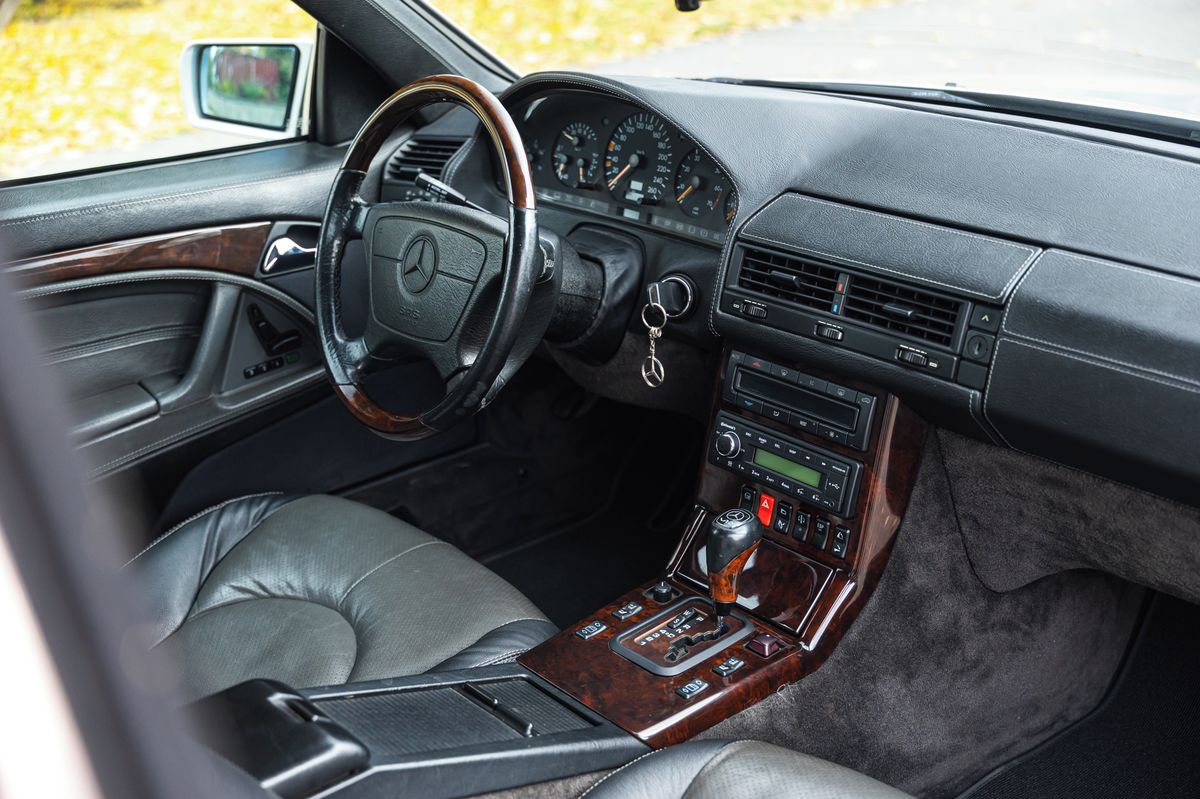 VIN říká vše podstatné o verzi, místu výroby a specifikaci a řadí vůz do roku 1996, což je prakticky sweet spot produkce, protože vůz už je vybaven modernější pětistupňovou elektronicky řízenou převodovkou 5G-Tronic, která nahradila starší (a těžší) hydrauliku, ale zároveň má klasicky čistý devadesátkový vzhled. Ještě zajímavější je ale originální datový štítek, pro sběratele samozřejmě mnohem cennější než samotný VIN, protože obsahuje kódy výbav a barev, s nimiž auto vyjelo z fabriky. V tomto případě mluví jasně - vůz je vybaven koženým čalouněním Exclusive a z továrny vyjel v ikonické metalíze Brilliant Silver, což je nejklasičtější barva mercedesů té doby. První majitel z Japonska si navolil ještě poplašné zařízení proti krádeži, ale také stěrače a ostřikovače světlometů, typický znak luxusních verzí s velkými motory. A kdyby se někdo uvnitř nudil, protože motor je tak tichý, může si užít sound systém od Bose, laděný přímo pro dvoumístný interiér.